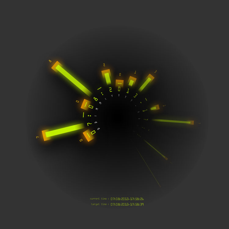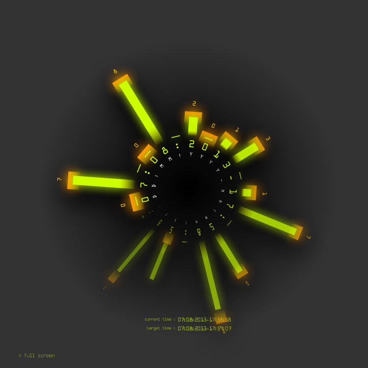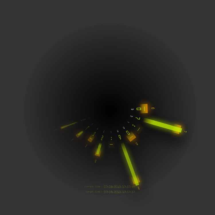This visual clock face allows you to set dates in the future, along with a message to be shown when that time arrives, and a URL link to share with the world. There are two sets of markers - target time shown in orange, and the current time, animating as it progresses, shown in green.