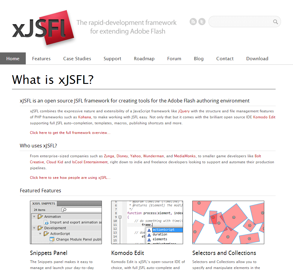 It combines the expressive nature and extensibility of a JavaScript framework like jQuery with the structure and file management features of PHP frameworks such as Kohana, to make working with JSFL easy. Not only that but it comes with the brilliant open source IDE Komodo Edit supporting full JSFL auto-completion, templates, macros, publishing shortcuts and more.