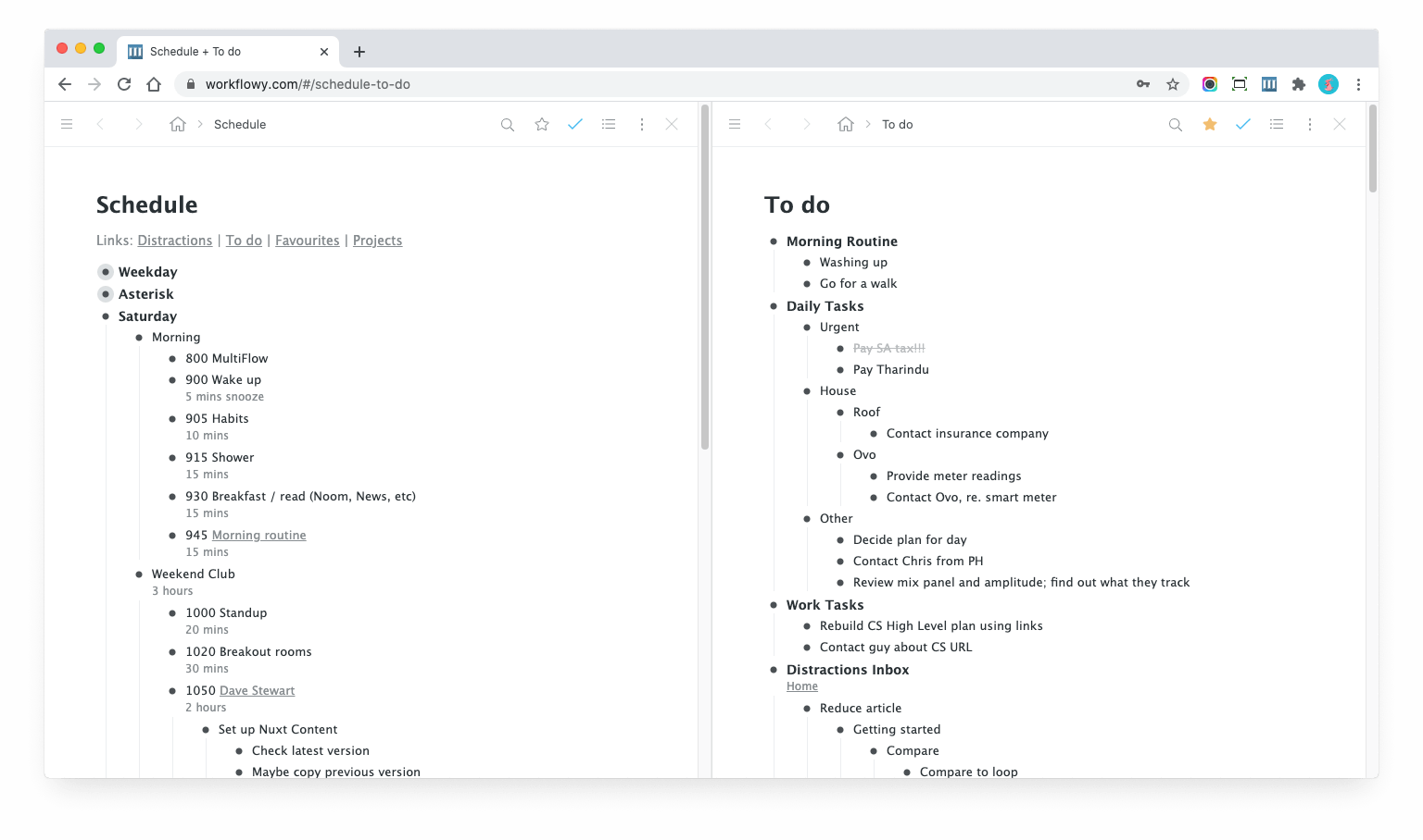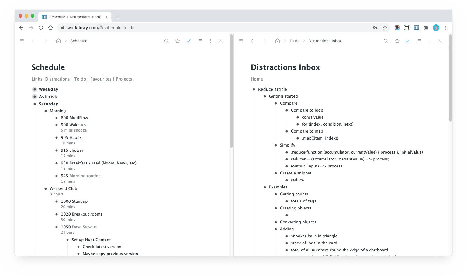 | Make multi-pane views bookmarkable | Hack the WorkFlowy URL to do something like #abc/def/ghi then automatically load frames on load |